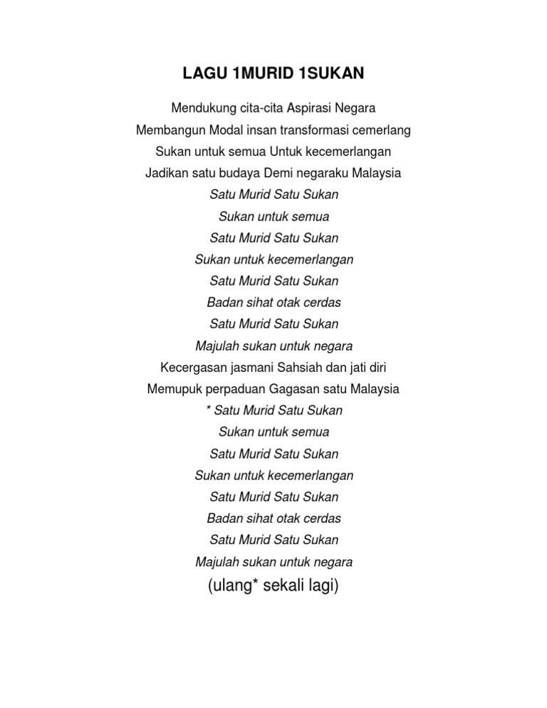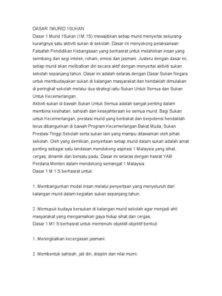 Source: cf.shopee.com.my Dasar ini selaras dengan dasar sukan negara yang memberi penekanan kepada sukan untuk semua dan sukan untuk kecemerlangan. Buku panduan 1 murid 1 sukan (1m1s). Dasar ini menyokong pelaksanaan falsafah pendidikan kebangsaan yang berhasrat untuk melahirkan insan yang seimbang dari segi intelek, rohani, emosi dan jasmani. Lirik lagu 1 murid 1 sukan. Aktiviti sukan di bawah sukan untuk semua adalah sangat penting dalam membina kesihatan, sahsiah dan kesejahteraan semua murid.